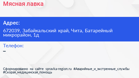 Мясная лавка по адресу 672039, Забайкальский край, Чита, Батарейный микрорайон, 1д в дальнейшем Организация, размещена в следующих категориях: