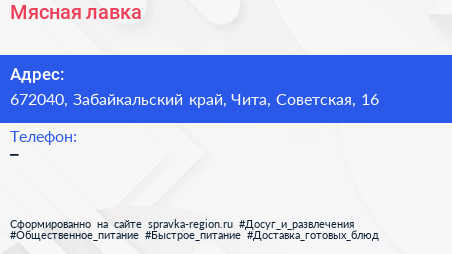 Мясная лавка по адресу 672040, Забайкальский край, Чита, Советская, 16 в дальнейшем Организация, размещена в следующих категориях: