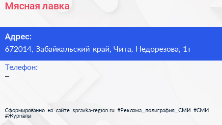 Мясная лавка по адресу 672014, Забайкальский край, Чита, Недорезова, 1т в дальнейшем Организация, размещена в следующих категориях: