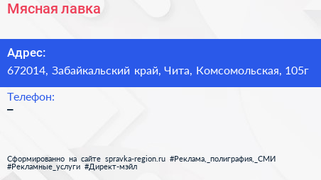 Мясная лавка по адресу 672014, Забайкальский край, Чита, Комсомольская, 105г в дальнейшем Организация, размещена в следующих категориях: