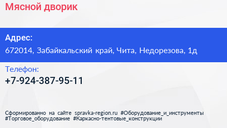 Мясной дворик по адресу 672014, Забайкальский край, Чита, Недорезова, 1д в дальнейшем Организация, размещена в следующих категориях: