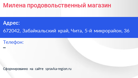 Милена, продовольственный магазин по адресу 672042, Забайкальский край, Чита, 5-й микрорайон, 36 в дальнейшем Организация, размещена в следующих категориях: