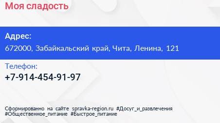 Моя сладость по адресу 672000, Забайкальский край, Чита, Ленина, 121 в дальнейшем Организация, размещена в следующих категориях: