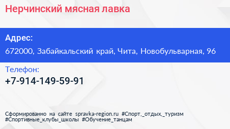 Нерчинский, мясная лавка по адресу 672000, Забайкальский край, Чита, Новобульварная, 96 в дальнейшем Организация, размещена в следующих категориях: