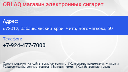 OBLAQ, магазин электронных сигарет по адресу 672012, Забайкальский край, Чита, Богомягкова, 50 в дальнейшем Организация, размещена в следующих категориях: