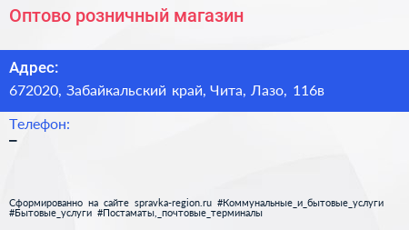 Оптово-розничный магазин по адресу 672020, Забайкальский край, Чита, Лазо, 116в в дальнейшем Организация, размещена в следующих категориях: