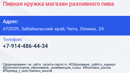 Пивная кружка, магазин разливного пива по адресу 672039, Забайкальский край, Чита, Ленина, 24 в дальнейшем Организация, размещена в следующих категориях: