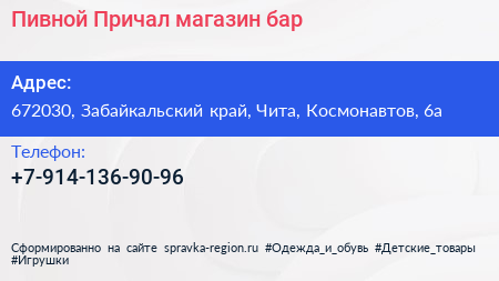 Пивной Причал, магазин-бар по адресу 672030, Забайкальский край, Чита, Космонавтов, 6а в дальнейшем Организация, размещена в следующих категориях: