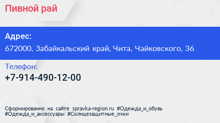 Пивной рай по адресу 672000, Забайкальский край, Чита, Чайковского, 36 в дальнейшем Организация, размещена в следующих категориях: