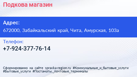 Подкова, магазин по адресу 672000, Забайкальский край, Чита, Амурская, 103а в дальнейшем Организация, размещена в следующих категориях: