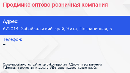 Продмикс, оптово-розничная компания по адресу 672014, Забайкальский край, Чита, Пограничная, 5 в дальнейшем Организация, размещена в следующих категориях: