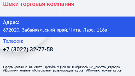 Шеки, торговая компания по адресу 672020, Забайкальский край, Чита, Лазо, 116в в дальнейшем Организация, размещена в следующих категориях: