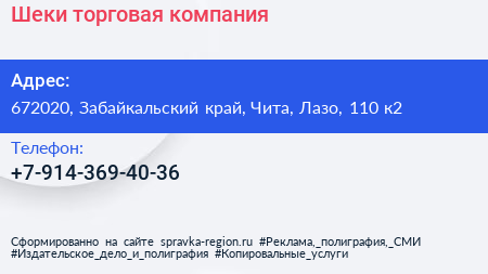 Шеки, торговая компания по адресу 672020, Забайкальский край, Чита, Лазо, 110 к2 в дальнейшем Организация, размещена в следующих категориях: