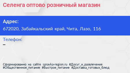 Селенга, оптово-розничный магазин по адресу 672020, Забайкальский край, Чита, Лазо, 116 в дальнейшем Организация, размещена в следующих категориях: