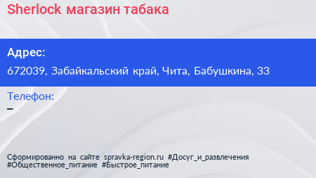 Sherlock, магазин табака по адресу 672039, Забайкальский край, Чита, Бабушкина, 33 в дальнейшем Организация, размещена в следующих категориях: