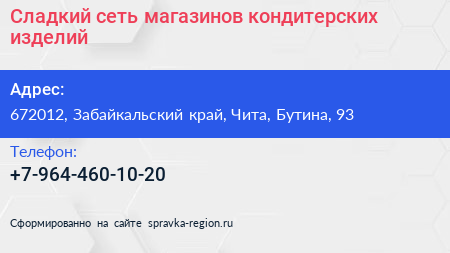 Сладкий, сеть магазинов кондитерских изделий по адресу 672012, Забайкальский край, Чита, Бутина, 93 в дальнейшем Организация, размещена в следующих категориях: