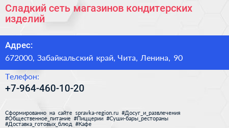 Сладкий, сеть магазинов кондитерских изделий по адресу 672000, Забайкальский край, Чита, Ленина, 90 в дальнейшем Организация, размещена в следующих категориях: