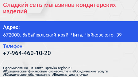 Сладкий, сеть магазинов кондитерских изделий по адресу 672000, Забайкальский край, Чита, Чайковского, 39 в дальнейшем Организация, размещена в следующих категориях: