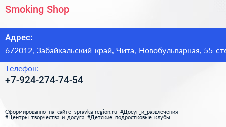 Smoking Shop по адресу 672012, Забайкальский край, Чита, Новобульварная, 55 ст6 в дальнейшем Организация, размещена в следующих категориях: