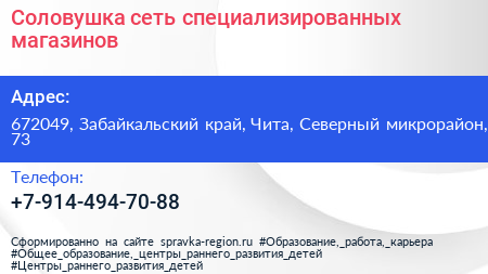Соловушка, сеть специализированных магазинов по адресу 672049, Забайкальский край, Чита, Северный микрорайон, 73 в дальнейшем Организация, размещена в следующих категориях: