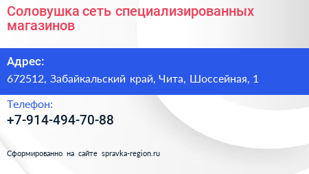 Соловушка, сеть специализированных магазинов по адресу 672512, Забайкальский край, Чита, Шоссейная, 1 в дальнейшем Организация, размещена в следующих категориях: