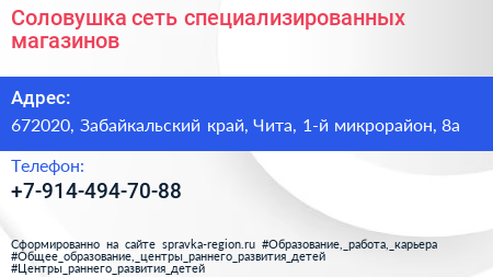 Соловушка, сеть специализированных магазинов по адресу 672020, Забайкальский край, Чита, 1-й микрорайон, 8а в дальнейшем Организация, размещена в следующих категориях: