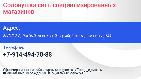 Соловушка, сеть специализированных магазинов по адресу 672027, Забайкальский край, Чита, Бутина, 58 в дальнейшем Организация, размещена в следующих категориях: