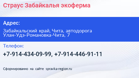 Страус Забайкалья, экоферма по адресу Забайкальский край, Чита, автодорога Улан-Удэ-Романовка-Чита, 7 в дальнейшем Организация, размещена в следующих категориях: