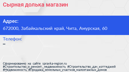 Сырная долька, магазин по адресу 672000, Забайкальский край, Чита, Амурская, 60 в дальнейшем Организация, размещена в следующих категориях: