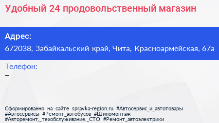 Удобный 24, продовольственный магазин по адресу 672038, Забайкальский край, Чита, Красноармейская, 67а в дальнейшем Организация, размещена в следующих категориях:
