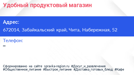 Удобный, продуктовый магазин по адресу 672014, Забайкальский край, Чита, Набережная, 52 в дальнейшем Организация, размещена в следующих категориях: