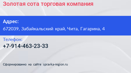 Золотая сота, торговая компания по адресу 672039, Забайкальский край, Чита, Гагарина, 4 в дальнейшем Организация, размещена в следующих категориях: