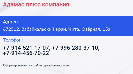 Адамас плюс, компания по адресу 672512, Забайкальский край, Чита, Озёрная, 15а в дальнейшем Организация, размещена в следующих категориях: