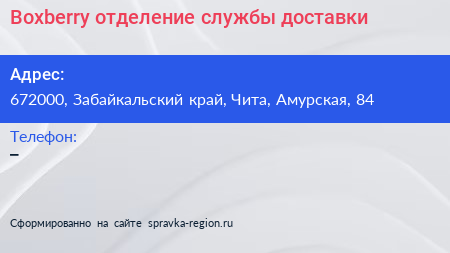 Boxberry, отделение службы доставки по адресу 672000, Забайкальский край, Чита, Амурская, 84 в дальнейшем Организация, размещена в следующих категориях: