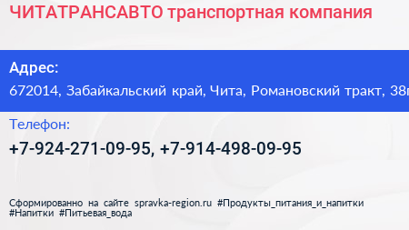 ЧИТАТРАНСАВТО, транспортная компания по адресу 672014, Забайкальский край, Чита, Романовский тракт, 38г в дальнейшем Организация, размещена в следующих категориях:
