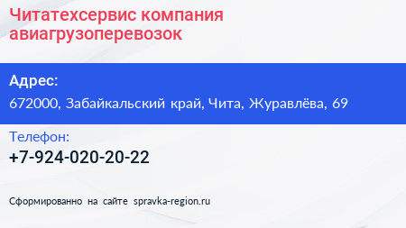 Читатехсервис, компания авиагрузоперевозок по адресу 672000, Забайкальский край, Чита, Журавлёва, 69 в дальнейшем Организация, размещена в следующих категориях: