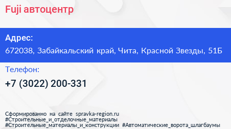 Fuji, автоцентр по адресу 672038, Забайкальский край, Чита, Красной Звезды, 51Б в дальнейшем Организация, размещена в следующих категориях: