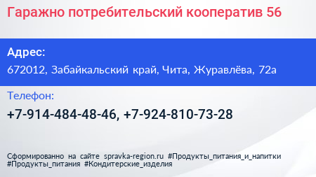 Гаражно-потребительский кооператив №56 по адресу 672012, Забайкальский край, Чита, Журавлёва, 72а в дальнейшем Организация, размещена в следующих категориях: