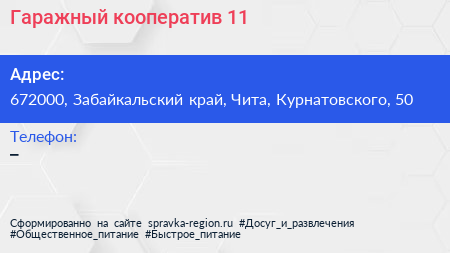 Гаражный кооператив №11 по адресу 672000, Забайкальский край, Чита, Курнатовского, 50 в дальнейшем Организация, размещена в следующих категориях: