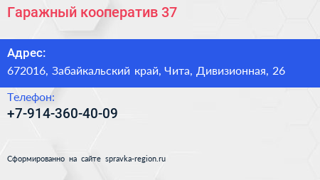 Гаражный кооператив №37 по адресу 672016, Забайкальский край, Чита, Дивизионная, 26 в дальнейшем Организация, размещена в следующих категориях: