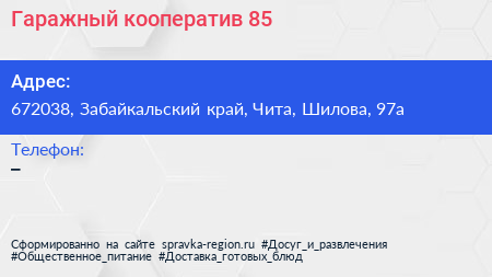 Гаражный кооператив №85 по адресу 672038, Забайкальский край, Чита, Шилова, 97а в дальнейшем Организация, размещена в следующих категориях: