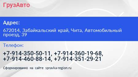 ГрузАвто по адресу 672014, Забайкальский край, Чита, Автомобильный проезд, 39 в дальнейшем Организация, размещена в следующих категориях: