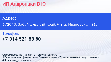 ИП Андронаки В.Ю. по адресу 672040, Забайкальский край, Чита, Ивановская, 31а в дальнейшем Организация, размещена в следующих категориях: