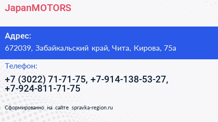 JapanMOTORS по адресу 672039, Забайкальский край, Чита, Кирова, 75а в дальнейшем Организация, размещена в следующих категориях: