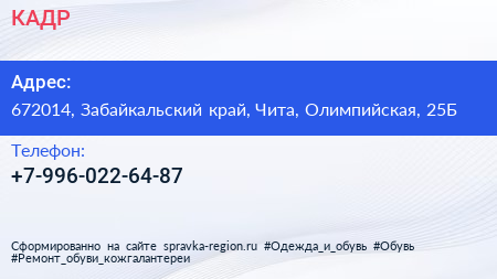 КАДР по адресу 672014, Забайкальский край, Чита, Олимпийская, 25Б в дальнейшем Организация, размещена в следующих категориях: