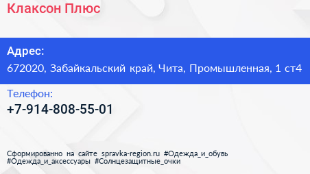 Клаксон Плюс по адресу 672020, Забайкальский край, Чита, Промышленная, 1 ст4 в дальнейшем Организация, размещена в следующих категориях: