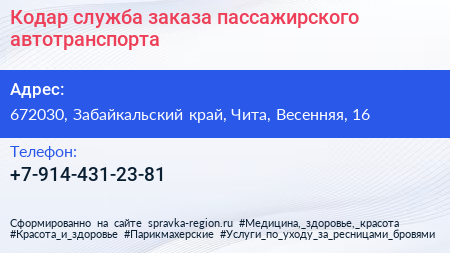 Кодар, служба заказа пассажирского автотранспорта по адресу 672030, Забайкальский край, Чита, Весенняя, 16 в дальнейшем Организация, размещена в следующих категориях: