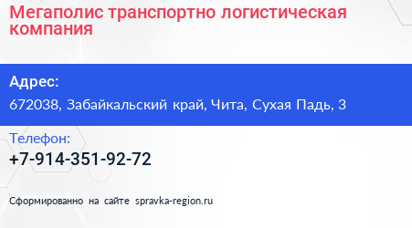 Мегаполис, транспортно-логистическая компания по адресу 672038, Забайкальский край, Чита, Сухая Падь, 3 в дальнейшем Организация, размещена в следующих категориях: