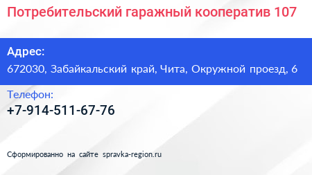 Потребительский гаражный кооператив №107 по адресу 672030, Забайкальский край, Чита, Окружной проезд, 6 в дальнейшем Организация, размещена в следующих категориях: