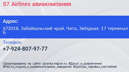 S7 Airlines, авиакомпания по адресу 672018, Забайкальский край, Чита, Звёздная, 17 терминал Б в дальнейшем Организация, размещена в следующих категориях: